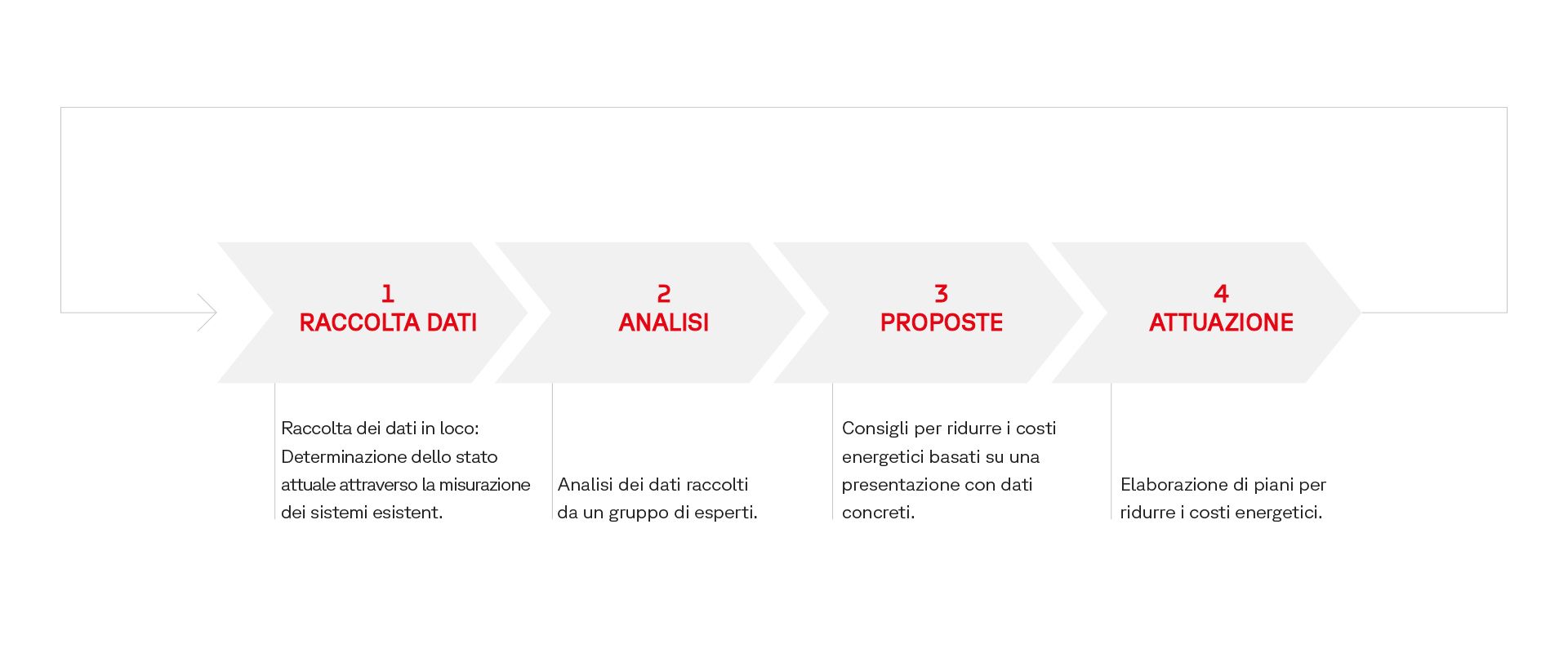Insieme a voi, esaminiamo e valutiamo lo stato del vostro impianto, analizzando il potenziale di ottimizzazione dal punto di vista ecologico ed economico, in linea con i vostri obiettivi di produzione e sostenibilità. Vi forniremo quindi proposte e layout concreti, nonché dati affidabili, che vi saranno utili per prendere decisioni informate.
